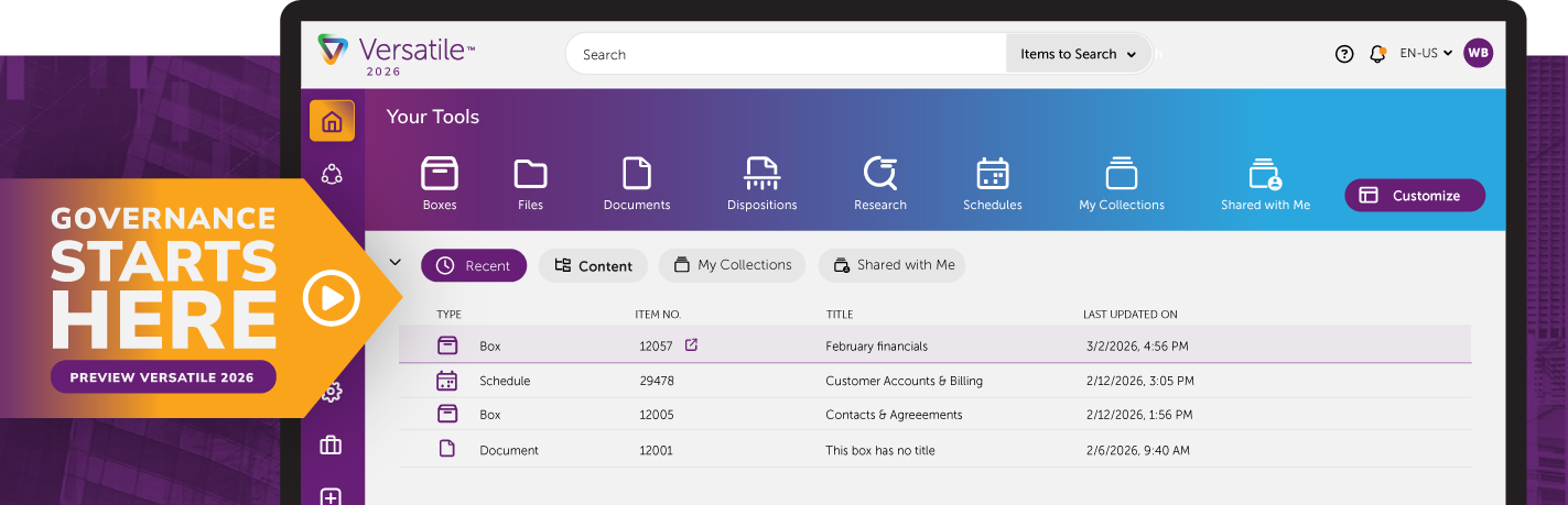 Our intuitive, scalable records management and retention software can meet the needs of your business, no matter the size of your industry. Effortlessly manage the complete lifecycle of your onsite, offsite, electronic, or physical records—and feel confident your records comply with local, state, and federal regulations.